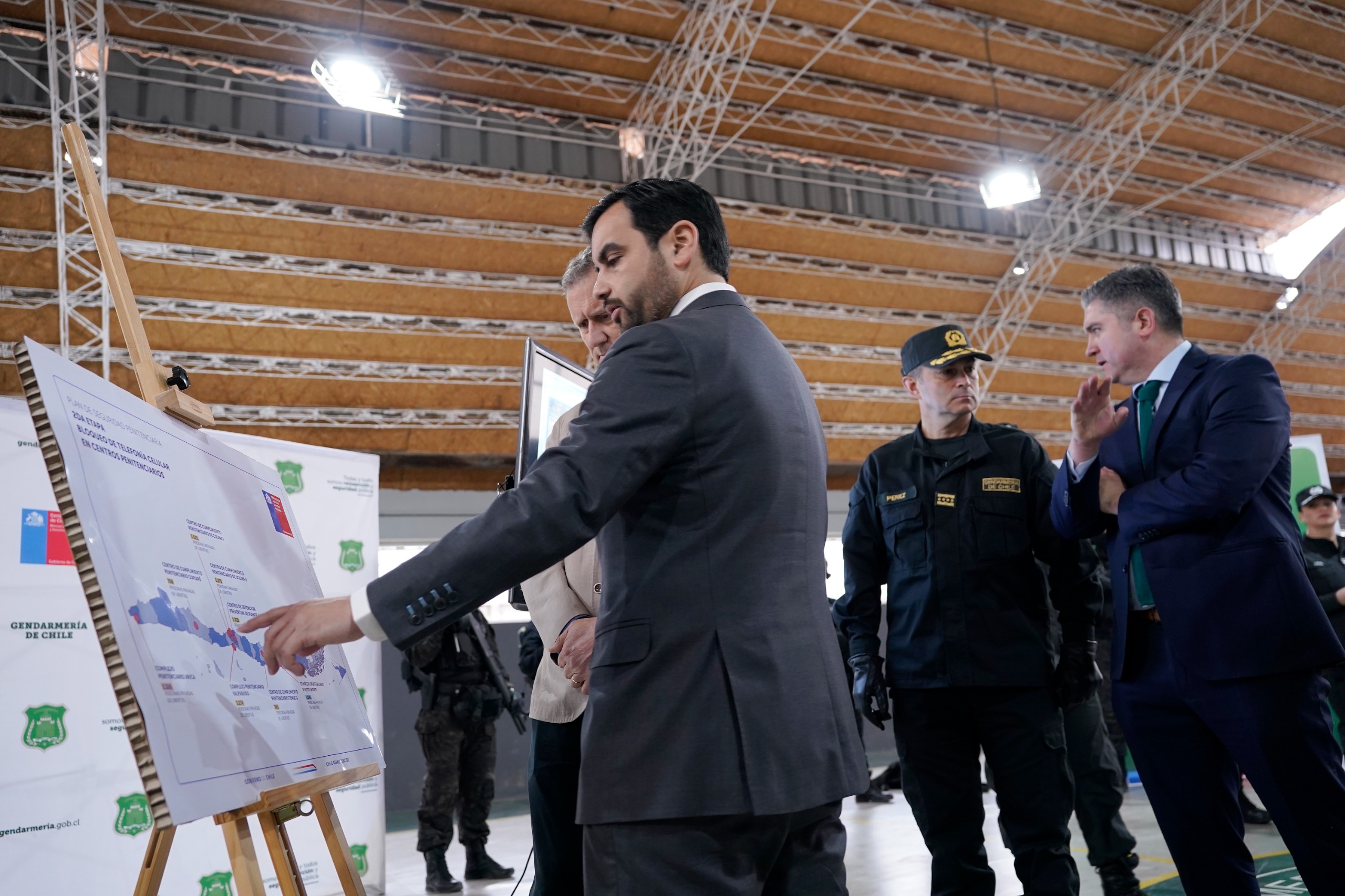 El Ministro de Justicia y Derechos Humanos, Jaime Gajardo Falcón, junto al titular del Ministerio de Transportes y Telecomunicaciones, Juan Carlos Muñoz Abogabir, y el Director Nacional de Gendarmería de Chile, Rubén Pérez Riquelme, dieron cuenta de la implementación de la segunda etapa del Sistema de Gestión y Bloqueo Telefónico en 9 unidades penales del país, las que albergan en total, a más de 17 mil personas privadas de libertad.