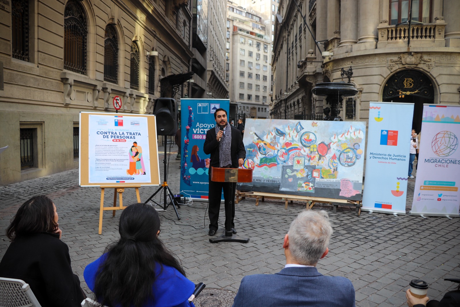En la Región Metropolitana, se desarrolló una plaza de gobierno junto a diversas instituciones, organizaciones de la sociedad civil y organismos internacionales. En la jornada se presentó un mural elaborado por el pintor Francisco Jaume Rueda y profesionales del Programa Apoyo a Víctimas, visibilizando el trabajo que realizan con las víctimas de trata de personas y su compromiso con la protección y la restitución de sus derechos.