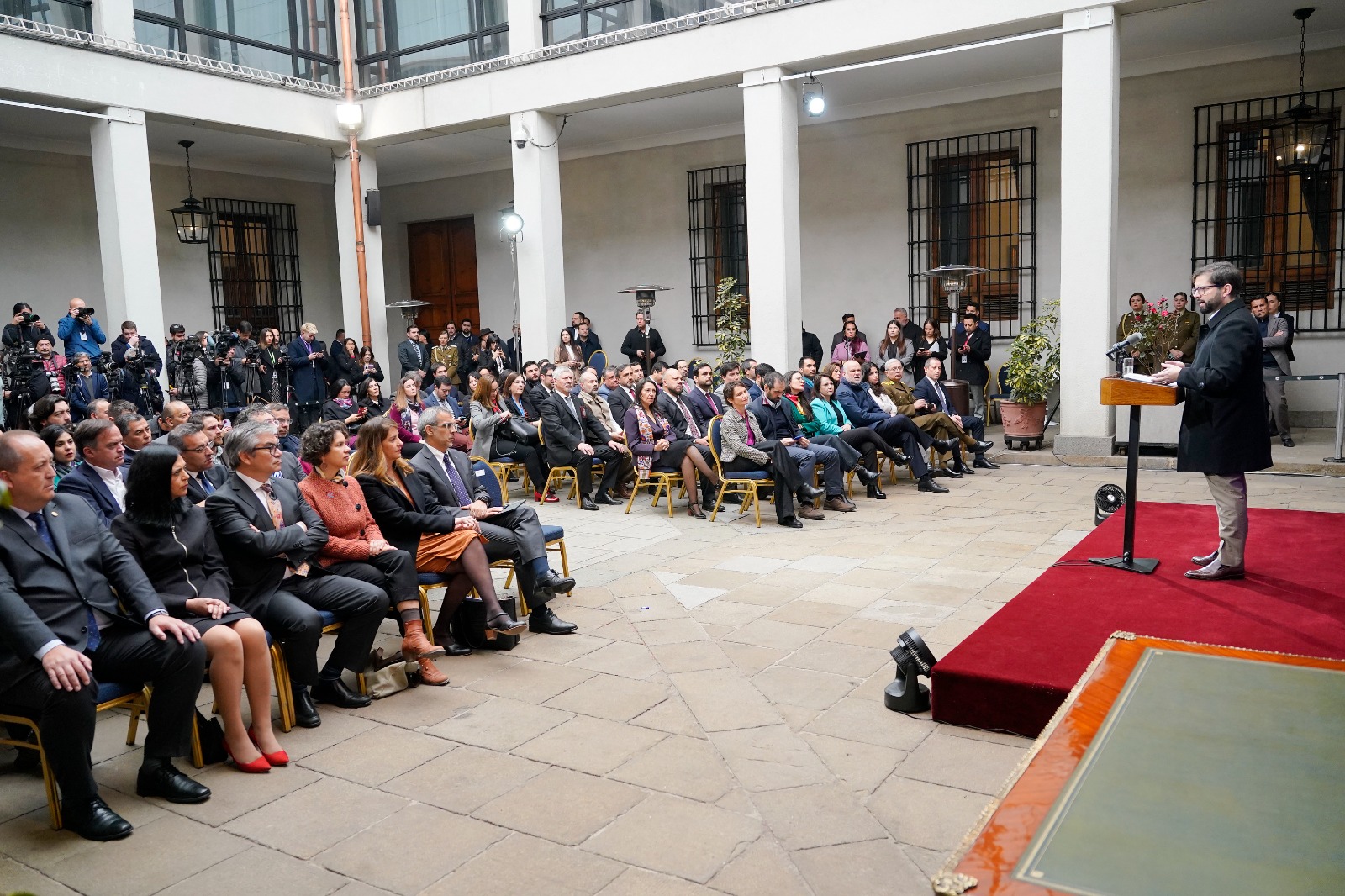 La ceremonia, que tuvo lugar en el Patio de Las Camelias del Palacio de La Moneda, contó con la participación de las ministras del Interior, Vocera de Gobierno y de la Mujer y Equidad de Género, Carolina Tohá, Camila Vallejo, y Antonia Orellana; junto a los ministros de Justicia y Derechos Humanos, de Hacienda, Segpres y Economía, Luis Cordero, Mario Marcel, Álvaro Elizalde y Nicolás Grau, respectivamente.